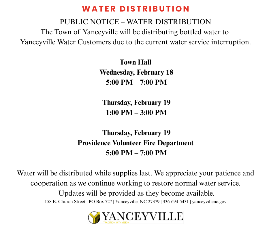 The Town of Yanceyville is distributing bottled water to its water customers at the Yanceyville Municipal Service Building on Wednesday evening and Thursday, February 19 from 1pm-3pm. They will also be at the Providence Volunteer Fire Department on Thursday, February 19 from 5pm-7pm.
