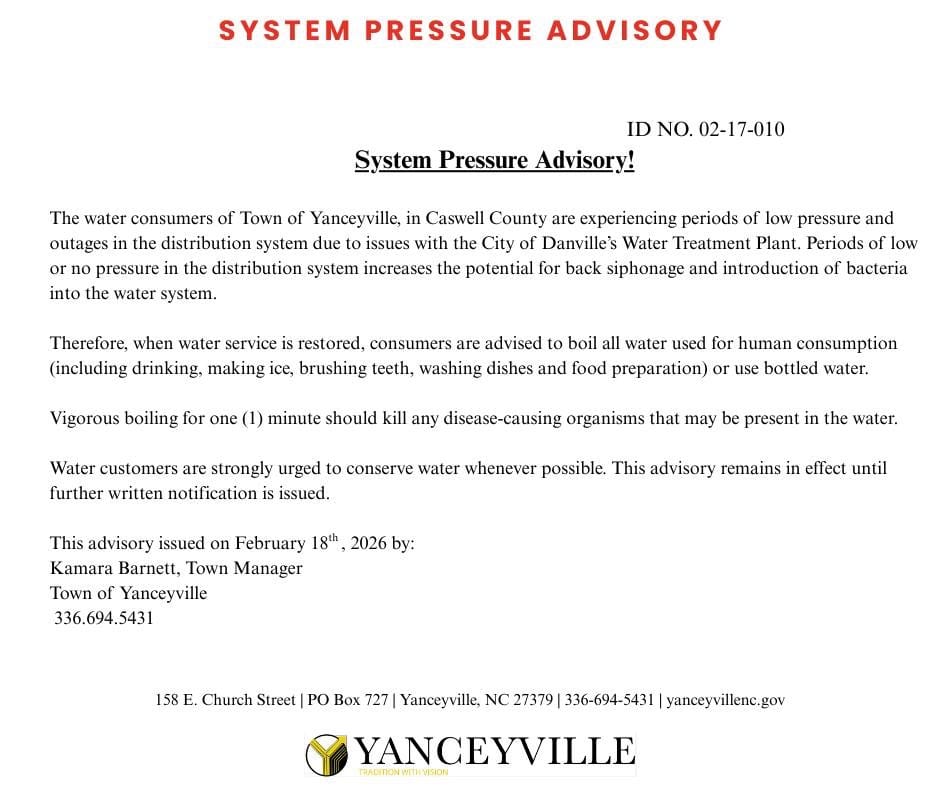 The boil water notice remains in effect until at least Friday. Residents and businesses are encouraged to confirm with the Town of Yanceyville and/or the City of Danville before you stop boiling water intended for consumption.