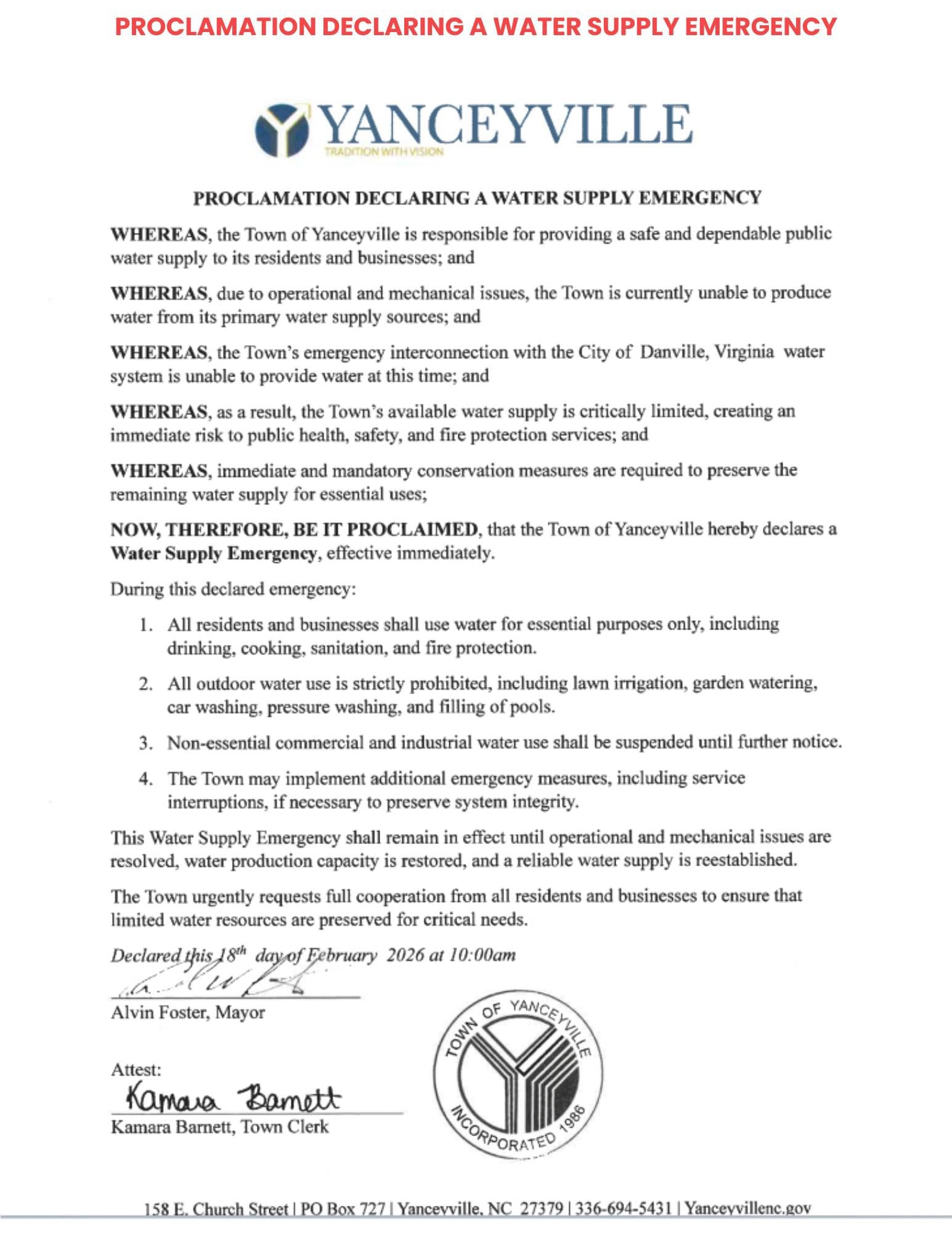 The Town of Yanceyville issued a proclamation declaring a Water Supply Emergency on Wednesday, asking residents and businesses to limit usage until supply is restored.
