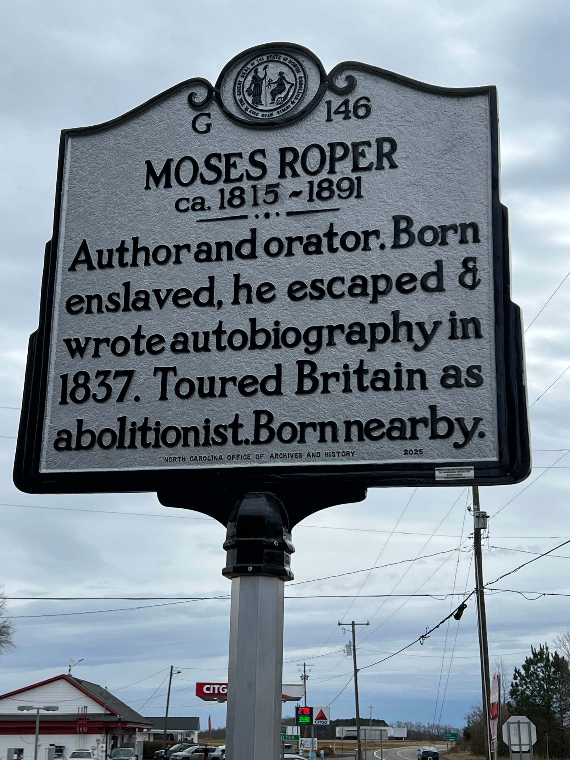 A state historical marker commemorating the life and achievements of Moses Roper has been erected at the intersection of NC Hwys 119 and 57 in Semora.